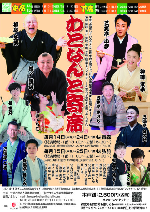 弘前かだれ劇場では、わどなんど寄席を毎月(日時のみ固定、曜日は変更)/中席(15日)下席(25日)開催しています。